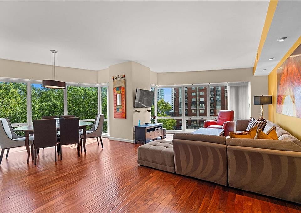 Welcome to high rise living at an incredible Buckhead location! Minutes to some of the city's best shopping, restaurants, and indulge in resort style amenities. This spacious two-bedroom, two-bathroom condo features hardwood floors, a true entrance foyer, floor-to-ceiling windows frame the beautiful views that fill the space with natural light, an open floor plan with high ceilings, a large primary suite with dual closets and dual vanities, a spacious secondary bedroom, and a modern layout with easy flow. Updated kitchen with stone countertops, a breakfast bar overlooking the family room and dining room, a true pantry and stainless-steel appliances. This unit comes with 1 assigned, secured garage parking space and lots of guest parking options and a secured storage unit. At The Oaks at Buckhead, you'll find a newly renovated lobby, 24-hour security, gated entry, fitness center, pool with pavilion, sauna, and more. Unbeatable location just steps to Lenox Square, Phipps Plaza, Publix, and Buckhead's top dining, with easy access to GA-400 and I-85. This is luxury, location, and lifestyle all in one perfect home. This home has served as a second home so has been very gently lived in and is turn-key and move-in ready!