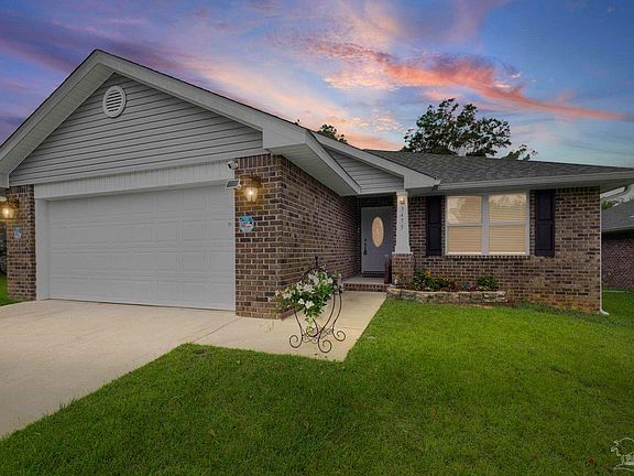 Come see this charming 3-bedroom, 2-bath brick home with a sparkling pool, perfect for relaxing or entertaining. Behind the property lies protected land that will never be built on, giving you added privacy and a serene backdrop. Enjoy your morning coffee while taking in the view of the pool and lush greenery. Inside, the home offers a functional layout with spacious living areas, updated lighting in the living and dining rooms, and generous closets throughout. The large master suite is a true retreat, offering plenty of space and comfort. Recent improvements include a new grinder pump for the public sewer system, a 1-year-old sprinkler system, double French doors, gutters, electronic pool safety system, cloth hurricane shutters, dishwasher, and floor storage above the garage. Additional touches include elegant chandeliers throughout the home and an outdoor shower. Located just 10 minutes from shopping and 30 minutes to downtown Pensacola and the beach, this home combines comfort, convenience, and thoughtful updates.