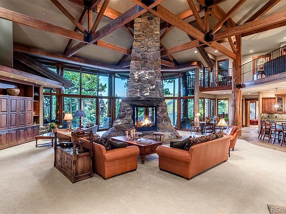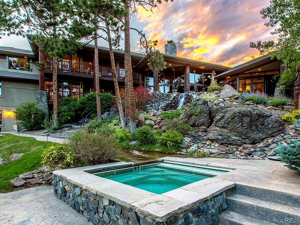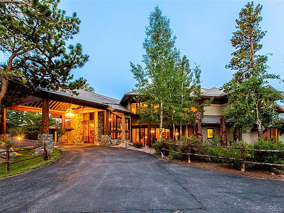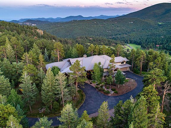 Colorado Mountain Living at its finest...Secluded at the top of Fox Ridge at Soda Creek in Evergreen, this 10+ acre spectacular custom estate is just what today's buyers are looking for: privacy, open space w panoramic mountain views & room for extended family. This 8261 finished sq. ft. "lodge" style home can sleep 10 comfortably on 3 levels. The massive log porte-cochère welcomes you into open 2 story great room w floor to ceiling see through moss rock & stone fireplace, w 25' lodge pole and pine timber beams, wood plank flooring, 8' Alder doors & custom hammered iron railings. Open kitchen, w center island slab granite breakfast bar that is accentuated by stone hearth over the gas cook top & formal, yet open dining room w wood floors & ceiling, & sliding doors with views of the front water feature. Handsome library w connected private office is complete w fireplace & custom wood built-ins. Main floor offers the expansive Master Retreat w huge walk in closet, luxurious 5 piece bath & 2 laundry rooms. One of the most spectacular features of this home is the magnificent, yet rustic professional landscaping, with multiple waterfalls (that can be heard from almost every room), professional irrigation system, large stone firepit (on brick patio), hot tub with electric cover, built-in outdoor kitchen & multiple exterior entertaining areas with custom built-in stone furnishings. Upper level has open oversize game room (overlooking the great room) complete w wet bar & sliding doors to the upper deck. There are two ensuite bedrooms & additional sitting room, perfect for guest apartment. Remodeled lower level has been designed as a wine grotto w wetbar & additional bonus area that can be a home gym as it walks out to the many tiered backyard & has a spa style bathroom w a sauna & Japanese style Soji doors. Offering the ultimate in privacy & mountain living, yet still only 45 minutes to first class ski areas & all that Denver sports & culture has to offer.