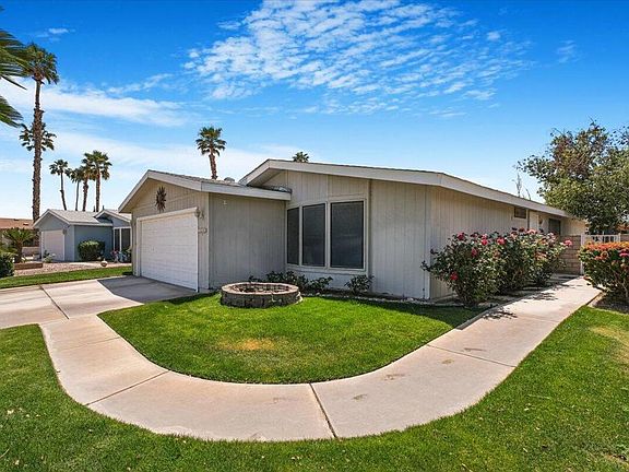 YOU OWN THE LAND!! Ivey Ranch is a 55 and better community with a 9 hole PGA rated golf course and driving range. There 4 community pools, 2 community spas, clubhouse and tennis courts.This home has an open floor plan - living room dining room and kitchen with 2 bedrooms and 2 baths and a laundry room.Sliding glass door in the dining room takes you to a very private walled grassy back yard with tile patio with overhang for shade.Don't forget the 2 car attached garage.You own the land and the home has foundation and can be financed.House is being sold 'as is' so bring your decorating touch and create your perfect home in the desert.