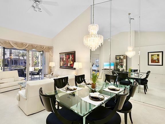 White leather sofas, elegant dining furniture and lake view at living area.