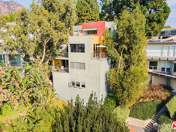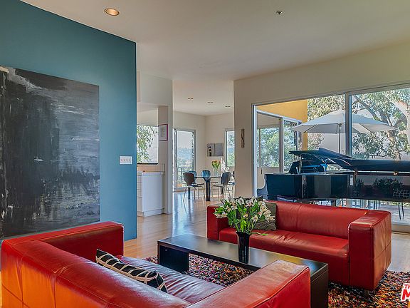 Nestled among towering eucalyptus & pine trees above the cherished Hollywood Knolls neighborhood, this striking architectural home w/ walls of glass & high ceilings capitalizes on surrounding nature, enchanting hillside views & a wealth of ambient light that evolves throughout the day. Designed w/ the modern lifestyle & an artistic aesthetic in mind, the open floor plan is bright & airy w/spacious public rooms that connect via hardwood floors. Effortless indoor-outdoor flow onto spacious balconies makes al fresco dining &/or star gazing a daily ritual. The true gourmet's wrap around kitchen w/ breakfast area is fully outfitted for creating/catering feasts for large gatherings. The entire upstairs level is devoted to a secluded master retreat w/ lg office, private balcony, walk-in closet, dressing area & bath w/ separate tub, dual vanity & step-in shower. Downstairs includes 2 large bdrms w/ media area & laundry rm. Below, a studio w/sound booth offers potential as 4th bedrm or ADU