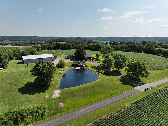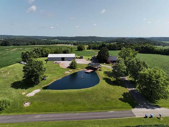 Country home with acreage located in a quiet rural area! This is the ideal hobby farm with a home surrounded by a scenic landscape. The home has 2,650 square feet of living space with three bedrooms (two masters) and four bathrooms, a full kitchen with a dedicated dining area and spacious living area. One master bedroom and bath have a walk-out porch. An additional ensuite bedroom and an in-law suite could be used as a man cave or storage. It is currently being used for storage. There are multiple covered porches. A beautiful pond sits in front of the home with a gazebo and pergola and provides a tranquil place to relax or entertain guests. A paved driveway leads up to the home and is surrounded by a large yard with manicured lawn, large shade trees and extensive landscaping. A 4,050 square foot shop sits next to the home and has a concrete floor, electric and large sliding doors. The property has a gently rolling topography with scenic views of the surrounding landscape. There are 13+/- tillable acres currently planted in soybeans for the 2022 season. The crop will pay for property taxes! A couple of pockets of timber and a wildlife pond provide some deer and turkey hunting opportunities. If you're looking for a country home with acreage in a quiet rural area, give us a call today and schedule your private tour!