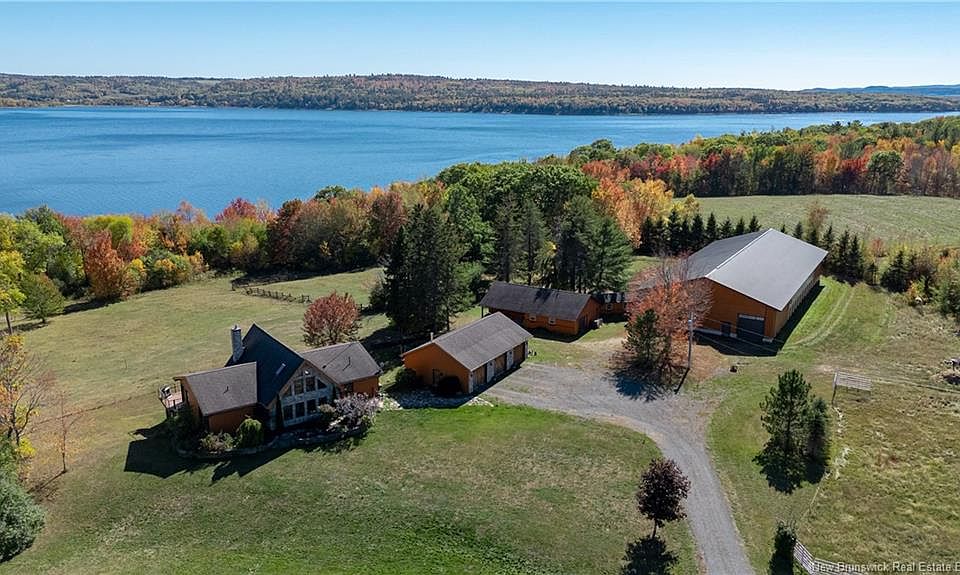 Experience the Yellowstone of New Brunswick - remarkable waterfront estate that perfectly marries luxury living with serenity of nature. Property offers rare combination of architectural brilliance and equestrian excellence, complete with indoor riding arena and 3 stall stable. Inside, main floor reveals open and inviting layout where chef’s kitchen with high-end finishes connects effortlessly to great room. Soaring ceilings, exposed beams, and floor-to-ceiling windows frame sweeping water views, while custom Italian staircase leads to stunning lofted retreat. Primary suite feels like private spa, featuring soaker tub, walk-in shower, and direct access to electric-screened sunroom and maintenance-free deck. In floor radiant heat ensures comfort throughout the seasons. Walkout lower level expands the living space with two guest bedrooms, family room, 3 piece bath, and impressive amenities including home theatre with fireplace, gym, and 6 person sauna. Step outdoors to screened lanai surrounded by lush landscaping, where gentle brook meanders under handcrafted stone bridges. Completing this dream estate are 3-bay garage with 50KW automatic generator and beautifully finished stable, hay and tack rooms, and cozy lounge - connected by breezeway to the bright indoor riding arena with insulated walls and automated windows. A true masterpiece designed for those who value craftsmanship, privacy, and the beauty of New Brunswick’s natural landscape.