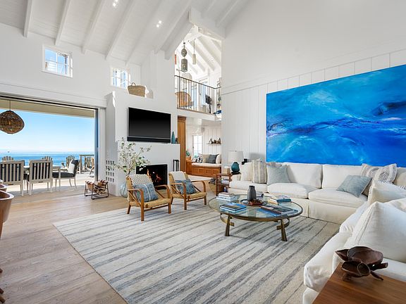 Designed with elegance and comfort in mind, the home features dramatic vaulted ceilings and an open-concept living space that seamlessly connects the living room, dining area, and chef's kitchen. The living room, complete with a cozy fireplace and mounted TV, opens via sliding pocket doors to a spacious deck overlooking the Pacific. Entertaining is a delight with room to dine indoors or out for ten, with easy access to each space allowing for the indoor-outdoor living that we all aspire to enjoy, enhanced by uninterrupted ocean views and effortless coastal breezes. The gourmet kitchen is a culinary masterpiece, boasting a large island with prep sink and bar seating, a six-burner gas range, top-of-the-line Wolf and Sub-Zero appliances, and a custom bar with a pass-through window to the outdoor patio.