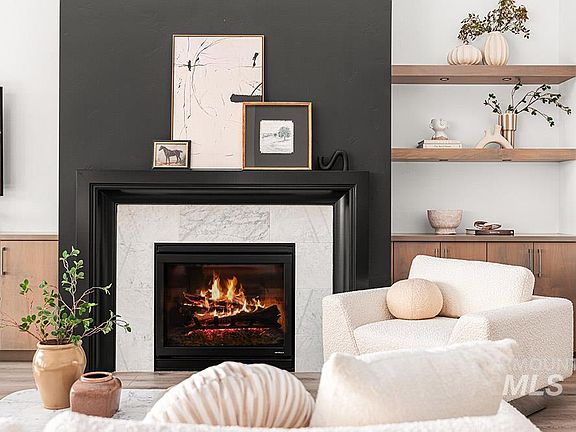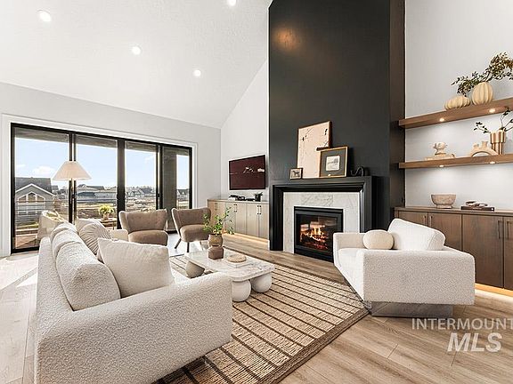 Welcome to this stunning single-level home featuring a massive RV bay, located in the highly desirable Creekwater subdivision. The interior showcases exquisite designer updates, custom wall treatments, and exceptional upgrades throughout. The great room impresses with cathedral-vaulted ceilings accented by exposed beams, a spacious open layout, and beautifully contrasting finishes. A dramatic floor-to-ceiling fireplace anchors the space and opens directly to the expansive outdoor entertaining patio, perfect for gatherings. The gourmet kitchen boasts designer two-toned cabinetry, a full tile backsplash, premier stainless steel appliances, and an expansive walk-in pantry with abundant storage and dedicated appliance countertops. The luxurious primary suite features elegant tray ceilings and a spa-like ensuite bath complete with dual vanities, a freestanding soaking tub, an oversized walk-in shower, and a generous walk-in dressing room. Spacious additional bedrooms provide room for guests, and a private tech office offers the ideal setup for remote work. Enjoy the fabulous Eagle location with access to a community pool and park, just minutes from Eagle Highschool and downtown Eagle shopping and dining!