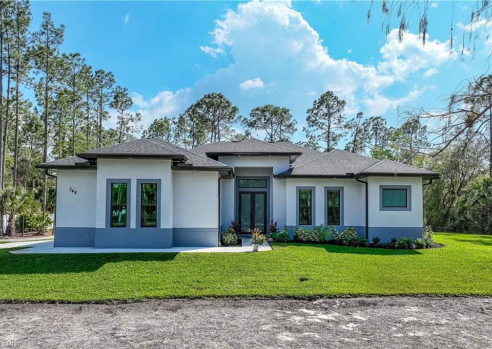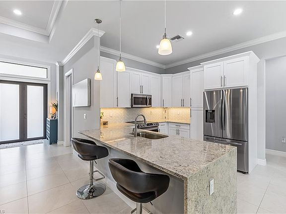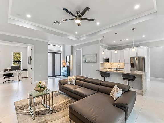 Ready for Hurricane season KOHLER WHOLE HOUSE GENERATOR with an inground 500 Gallon Propane tank, Light, Bright, and Amazing Home! This best describes this beautiful newer construction (2022) home! Better than new with a long list of upgrades and post-purchase improvements completed. This lovely home features 3 bedrooms plus an additional flex room/den currently used as a home office. Large open area kitchen with upgrades including Quartz counters with waterfall feature, 42-inch upper cabinets with crown molding and soft close doors/drawers, stainless steel appliances, and glass tile backsplash. The many enhancements throughout the home include 24-inch travertine tile, impact glass windows/doors, recessed ceilings with crown molding, an enhanced trim package, recessed lighting, and a large screened lanai with an outdoor kitchen. Exterior improvements are abundant with auto irrigation, asphalt driveway with extension, upgraded reverse osmosis water treatment system, Floratam sod, and fencing with front gate for property security. Large oversized garage with epoxy floors. This property is conveniently located within 2 miles of the Publix shopping center.