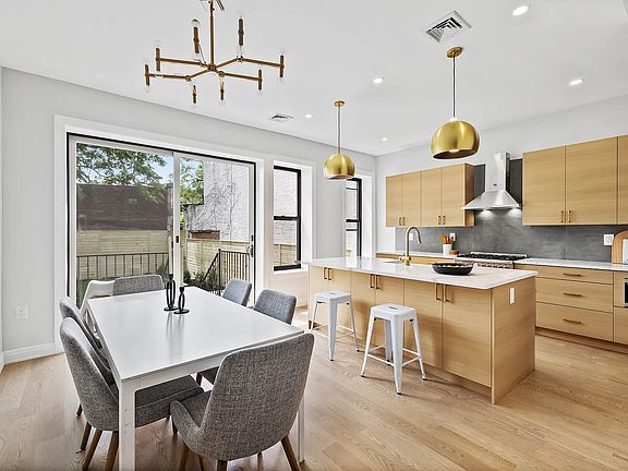 Enter into a spacious open-concept parlor level that seamlessly combines the living, dining, and kitchen spaces, as well as a half bath-providing a perfect setting for both relaxation and entertaining and is the epitome of sophistication and comfort. Natural light pours in through large windows and the sliding glass door overlooking the lush backyard garden, highlighting the tasteful finishes including solid oak hardwood floors and designer light fixtures.