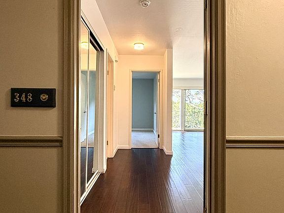 Come view this top floor end unit condo with spectacular views for rent! 348 Eden Roc Drive has dark wood floors in the living area and carpet in the bedroom. The kitchen has tiled counters and comes equipped with a stainless steel refrigerator, a microwave, and will be delivered with a brand new oven/range and dishwasher (which are still on the way and not reflected in the pictures). The living room has excellent natural light, with wall-to-ceiling windows that open onto a spacious deck. There are west facing views from the living room and deck that offer breathtaking views of Mt Tam. The living room windows come equipped with electric remote controlled blinds. The spacious bedroom has a window that also has an excellent view, and the bedroom closet has built in shelving.
