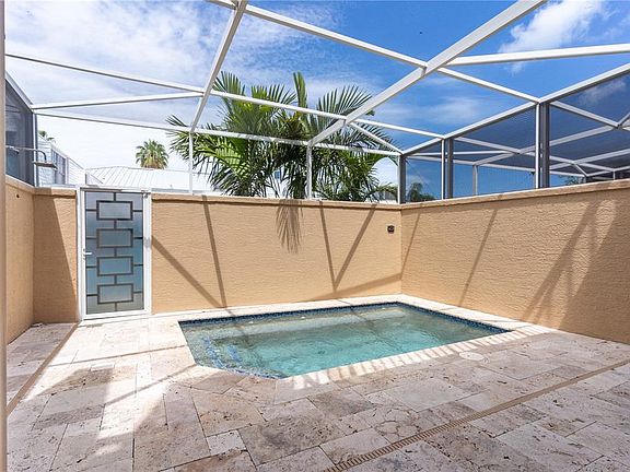 Screened plunge poolPrivate travertine-paved courtyardGranite countertopsOversized two-car garageLuxurious waterfront townhomeJack-and-jill bathroomSpa-style bath
