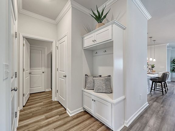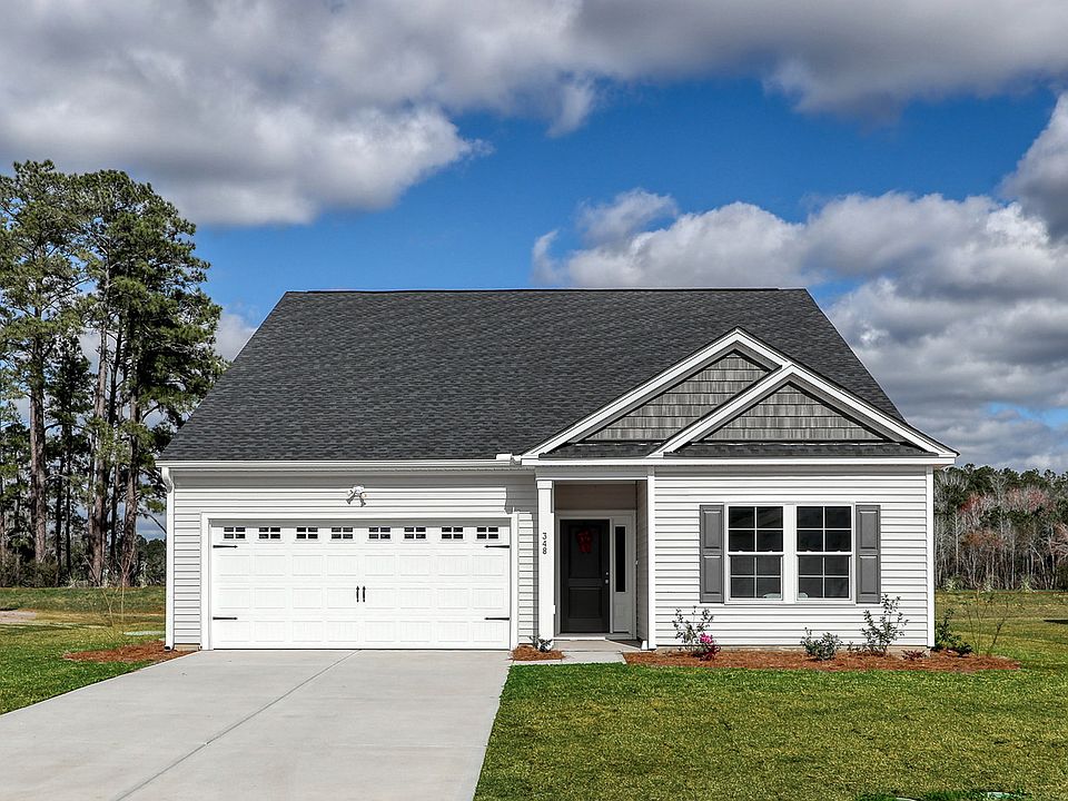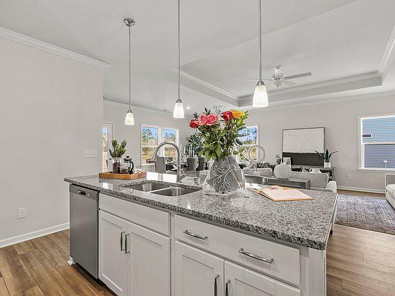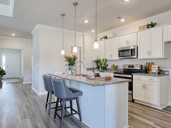 This Gwinnett plan is a single-story home with a rear extension and nine-foot ceilings. Complete with three bedrooms and two bathrooms. The primary bedroom connects to its own bathroom with a shower stall and a walk-in closet. The kitchen is completed with decorative crown molding, white cabinets, granite counters, and luxury vinyl plank flooring with an island complete with pendant lighting and a separate eating area leading into an open family room for easyentertaining. A large rear-covered back porch is a great space to read a book, get some fresh air, or just relax with your feet up!
