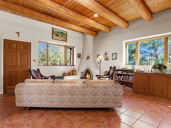 Bright Outlook - Located in the desirable residential area of Vegas de Taos Subdivision, this timeless Southwestern-style home blends classic charm with modern comfort all just minutes from town, restaurants, services, and Taos events. 1,479 sq.ft 2 bedrooms, 2 full baths, plus a bonus room off the living area, this home offers flexible space ideal for an office, studio, or den. Bonus room has a closet and could easily be a 3rd bedroom. The open-concept living area features high ceilings, pumice-crete construction, viga ceilings, nichos, and a kiva fireplace, creating a warm and inviting atmosphere. In-floor radiant heating throughout ensures year-round comfort. The light-filled kitchen boasts wooden cabinets with custom carving, skylight, a large functional island, and a separate dining area, perfect for entertaining or everyday living. The primary suite includes a large closet and a spacious bath with double sinks, bathtub, and a separate shower. The good-sized second bedroom is conveniently located near the second full bath. A laundry area in the hallway and abundant storage throughout add convenience and functionality. Tile and carpet floors, skylights, and expansive windows fill the home with natural light and showcase mountain and foothill views. A sliding glass door opens to a patio and naturally landscaped 0.37-acre yard, while a large gravel driveway provides ample parking. The attached 1-car garage offers parking, storage, or conversion to a studio or hobby space. The front courtyard features xeriscape landscaping, perennials, and a covered entry portal with stunning Taos Mountain views, completing this inviting and well-located home.