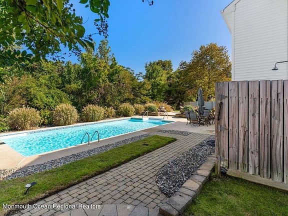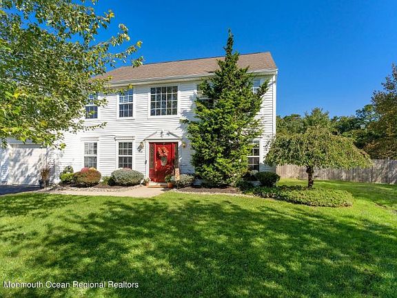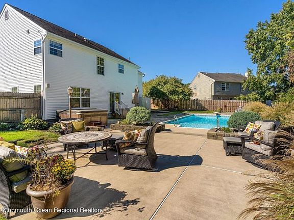 This 4 BR 21 2 BA colonial sits at the end of a cul-de-sac, backing up to the woods, in one of Brick's finest neighborhoods. Grand 2 story entrance foyer with beautiful chandelier on a motorized lift for easy cleaning. Hardwood floors throughout the first floor. Eat-in kitchen with center island, pantry, and 2 yr old stainless steel appliances, incl. Viking oven and microwave. Sliders to a beautiful, private, backyard oasis with inground pool, hot tub, concrete extended patio, outdoor shower, and nat. gas hookup for bbq. Perfect for outdoor entertaining! Master BR has beautiful Brazilian cherry hardwood floors, walk-in closet and en-suite bath with soaking tub and dual sink vanity. Brand new carpeting in the other 3 BRs. A C, furnace, and tankless hot water heater only 5 yrs old.