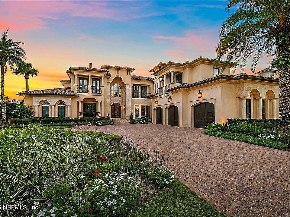 Mediterranean elegance meets coastal luxury on the 3rd hole of the Ponte Vedra Inn & Club Ocean Course, just steps from the beach. Situated on a private .64-acre lot, this estate showcases timeless design with soaring ceilings, expansive windows, and sweeping golf course views. The gourmet kitchen with Wolf and Sub-Zero appliances flows seamlessly into the great room and outdoor living spaces. The primary suite offers a serene retreat with spa-inspired bath and custom closets. Resort-style amenities include an elevator, office, and expansive lanai with fireplace, summer kitchen, and pizza oven. A sparkling pool/spa overlooks manicured greens while the ocean lies across the street. An unmatched lifestyle where golf and ocean converge in Ponte Vedra Beach.