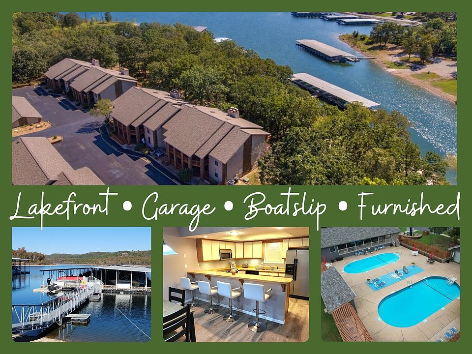 This rare LAKEFRONT spacious non-rental 2 bedroom, 2 bathroom condo with a leased boat slip and garage is exactly what you've been waiting for! Located in desirable Schooner Bay Landing in Kimberling City, this beautiful lower level condo checks all of the boxes. TURN KEY!!! Stainless steel kitchen appliances, additional small appliances, washer & dryer, propane grill, dishes, silverware, & cookware, oversized garage, TV, and practically brand new FURNITURE INCLUDED! No carpet! New lifeproof grey wood-look vinyl plank flooring throughout makes cleaning a breeze, keeps allergens to a minimum, and goes perfectly with the fresh paint. Walk right out to the lake from your covered back patio. For easy WALK-IN access, owners can also enter through the back patio. Leased boat slip just around the corner at Port of Kimberling Marina will transfer with condo - price includes Boat Floater boatlift! (You can even drive your golf cart or side by side into town for dinner or groceries and to your boat slip with permits) Besides Table Rock Lake access, Schooner Bay Landing also features a clubhouse that can be used free of charge and TWO amazing pools! Come take a look!