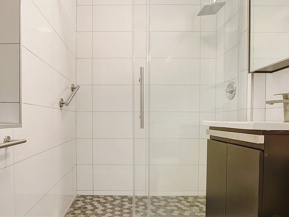 The two large bedrooms each contain built-in closets, flush-mount LED fixtures and custom hand-cut moldings. Both of the two full bathrooms are finished with floor-to-ceiling Arctic white marble tile, custom glass shower doors with brushed nickel motif, LED strip lighting and London grey self-closing vanity with recessed glass medicine cabinet.