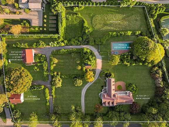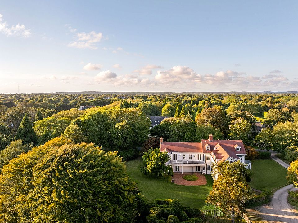 Built in 1895 and thoughtfully renovated in 1997 by architect John David Rose, Red Top Farm is a 3-story clapboard farmhouse that embodies Southampton's rich heritage while offering 8,720 SF+/- of modern living. Set on 2.9 acres+/-, the estate comprises 10 bedrooms, 7 full and 2 half bathrooms across the main residence, complemented by a 2-story guest house and a detached garage with an apartment. A pool, spa, and manicured grounds complete this rare Hamptons compound. Moments from pristine ocean beaches and Southampton Village, the estate sits south of the highway amid protected farmlands. Expansive lawns, specimen trees, and tall privet hedges provide privacy and a bucolic backdrop while keeping the village and ocean within easy reach. Inside, the farmhouse balances authenticity with sophistication. Custom millwork, vaulted ceilings, pendant lighting, and hardwood and tile floors define the interiors. French doors and classic 2/2 windows frame the gardens, while multiple wood-burning fireplaces add warmth and character. The kitchen is both functional and refined, with marble countertops, a farmhouse sink, and Bosch, Sub-Zero, and Viking appliances. The 3,151 SF+/- first floor opens with a sunlit foyer of mosaic tile windows and hardwood floors. The living and dining rooms, each with a fireplace, flow seamlessly to a family room, sitting room, and terraces beyond. The dining area accommodates 6+ guests with French doors. An eat-in kitchen with a breakfast area combines high-end appliances, custom cabinetry, and pendant lighting. An office, pantry, laundry, linen closet, and 2 powder baths complete this level. The 2,915 SF+/- second level is centered on the primary suite, a vaulted retreat with a wood-burning fireplace, a walk-in closet, and an en-suite bathroom. The level also offers 2 en-suite bedrooms, 1 with a fireplace, as well as 5 guest bedrooms served by 2 full bathrooms. The 2,655 SF+/- top floor offers 4 bedrooms, 2 full bathrooms, and 2 versatile rooms ideal for play, study, or studio use, along with hall access and attic storage. A 1,456 SF+/- legal guest house provides 2 levels with 3 bedrooms and 2 bathrooms, offering privacy and comfort for visitors. The 1,306 SF+/- garage incorporates a 2-story apartment with 3 bedrooms, 1 bathroom, and a full kitchen, designed for staff or extended stays. The home's 5-bay façade with clapboard siding, gable rooflines, Italianate overhang, and welcoming front porch evokes the classic architecture of Southampton's storied past. The red roof - once a defining landmark of Red Top Farm - crowns the residence, tying today's elegance to its 19th-century roots. Set within expansive lawns shaded by mature specimen trees, the property offers a balance of privacy and pastoral beauty. An oversized pool and detached spa, framed by a red-brick patio with bluestone coping and enclosed by a white picket fence, create an idyllic centerpiece for summer leisure. Beyond the pool, the aerial views reveal the estate's broad acreage, including open fields, landscaped hedges, and meandering gravel drives that reinforce its country estate character. The grounds also include a paddock and equestrian amenities, reflecting the property's agricultural heritage, while manicured hedgerows, gardens, and tree-lined perimeters speak to its evolution into a refined Southampton retreat. Blending historic charm with Hamptons leisure, the setting is at once enduringly timeless and beautifully livable. A rare offering south of the highway, Red Top Farm unites historic architecture with modern scale across nearly 3 acres+/-. With an 8,720 SF+/- main house, legal guest house, garage apartment, pool, and spa, this estate offers a complete Southampton compound of heritage, privacy, and enduring style.