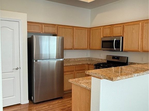 Beautiful, open, and spacious upstairs unit in a gated community! This 2-bedroom, 2-bath condo offers a flexible layout, with both bedrooms featuring attached bathrooms perfect for using as two primary suites. The bedrooms are thoughtfully separated, providing added privacy. The living room is bright and inviting, complete with vaulted ceilings, a gas fireplace, and wood flooring throughout. Ceiling fans in every room keep the space comfortable year-round. The kitchen boasts a breakfast bar that overlooks the living area, and charming pot shelves in the bedrooms add a unique touch. Step out onto the covered patio and enjoy scenic mountain views. The unit comes with a separate 1-car garage plus a carport, and all appliances are included for your convenience. Community amenities include a sparkling pool, fitness center, and a community center with a pool table perfect for relaxing and socializing. Note: Tenant to verify all information.