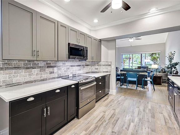 In a lovely enclave of attached villa homes, this renovated residence with a beautiful kitchen, new cabinetry, stainless appliances and quartz countertops with a built-in coffee bar will welcome you home after a long day on the golf course. A spacious two-car garage provides a comfortable and secure spot for cars, bikes and beach toys. This residence offers the comfort of wood-look plank tile floors with baseboards and crown molding. The restful primary suite and updated bath and customs closet provide a respite from worries of the world. Some windows have been replaced with impact glass, providing a sense of security in summer months. Enjoy the beautiful lake view from the spacious lanai with hurricane shutters and fun cabana lighting. The Pelican Landing community is close to nearby Coconut Point Mall, with dining, shopping and entertainment, and the airport is a quick 20-minute drive. There is also a private beach island accessed by a nearby water shuttle, and canoe and kayak, fitness, pickleball, tennis and bocce complete your luxury lifestyle!