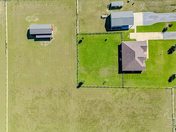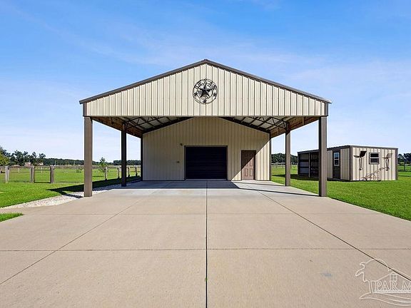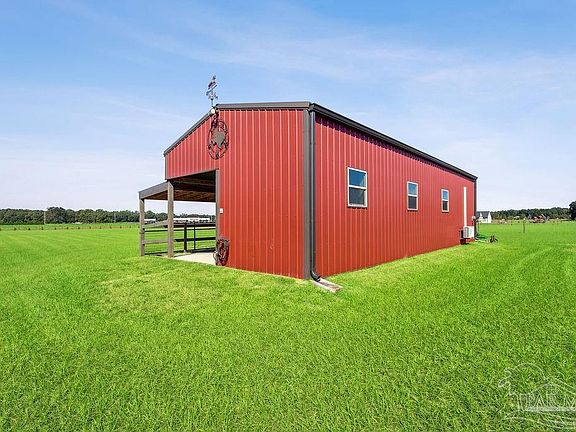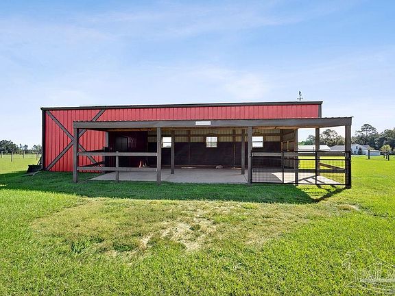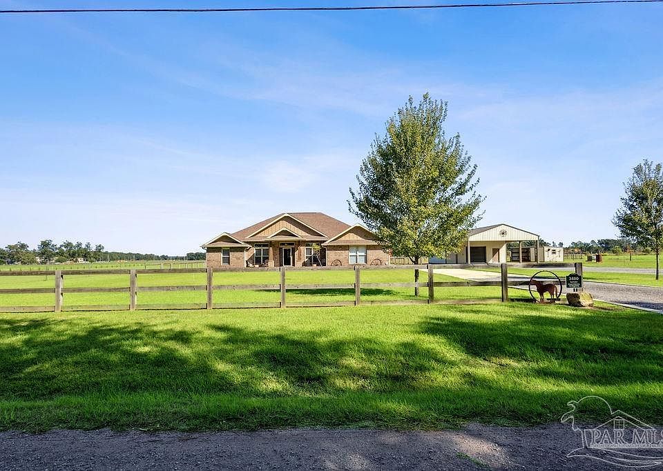 Beautiful all-brick custom home featuring 4 bedrooms and 3 full baths with a custom Florida room and two enclosed shops/barns on 5 fully fenced acres in Pace, Florida! Built in 2017, this property showcases high-end finishes inside and out with thoughtful upgrades throughout. Inside you’ll find an open, split floor plan with tile flooring in main areas and LVP in the bedrooms and office. The home features plantation shutters across the front, a dining area with wood accent wall, chair railing and trimmed windows, and an electric brick fireplace that creates a warm focal point in the living room. The kitchen includes granite countertops, soft-close drawers, a spacious pantry, and tile backsplash. The hallway includes a full bath with a nearby bedroom and built-ins in the closet. Three-way split layout offers two additional bedrooms and full baths on the opposite side of the living area. The master suite includes custom built-ins, a large walk-in tile shower with glass enclosure, and a drop-in soaking tub. Additional features include a hard-wired security system, all-electric utilities, and an enclosed Florida room with mini-split for year-round comfort. Outside you’ll find beautiful acreage and multiple functional outbuildings. The former horse barn (20x48) is insulated and equipped with power, water, and a mini-split A/C. The detached shop (30x24) includes power and water, plus an additional 30x24 covered carport for parking. Concrete work, gutters, and epoxy finishes were professionally completed by Ninja Coating. Property also includes irrigation, both well and city water access. This one checks every box—custom, turn-key, private, and ready to enjoy. Conveniently located just 5 minutes to Publix and 20 minutes to Pensacola—tucked away, yet close to town and amenities!