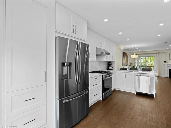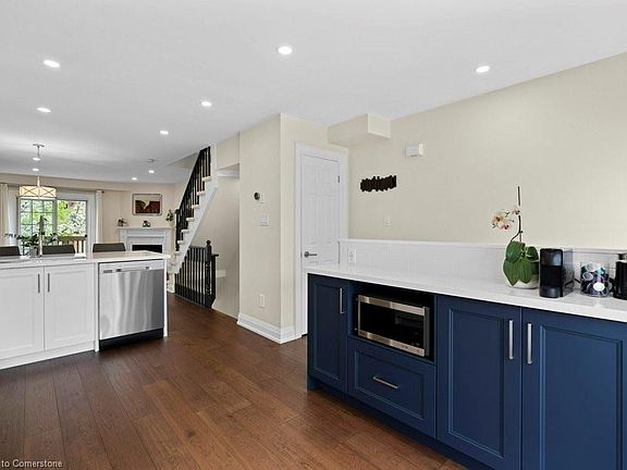 Welcome to 113-3480 Upper Middle, in the well loved Tuck’s Forest complex! This three storey townhouse is the beautifully renovated starter home that you’ve been looking for in Burlington. Renovated top to bottom in 2021, this townhome is a stand-out! The open concept main floor is bright and inviting with hardwood flooring throughout. The modern kitchen renovation showcases a coffee bar for additional counterspace and storage, full height cabinetry, quartz countertops, upgraded stainless steel appliances, and convenient breakfast bar. The dining room features seating at the kitchen breakfast bar, as well as space for a full sized dining table. The living room offers sliding doors out to your balcony, as well as a refinished gas fireplace for a cozy winter. Headed upstairs, you will find two large bedrooms, with vaulted ceilings for an airy feel and the same consistent hardwood flooring. The primary bedroom has been altered to offer two full depth closets, and overlooks a beautiful flowering tree in the back! The modern bathroom has been completely re-done and is larger than what you'd find in most units! Offering a floating vanity, glass walk-in shower, stand alone tub, and in-room linen storage. Bedroom level laundry (with full sized machines, not the tiny condo ones) complete the upper level. Down on the ground level, you’ll find a family room, complete with heated tile floors, a wall of built in cabinets, and a half bath. With sliding doors out to the fenced backyard, as well as interior access to the garage, this level offers ultimate versatility. Located in a quiet and well-maintained complex, this home is just minutes from schools, amenities, and offers easy commuting options.