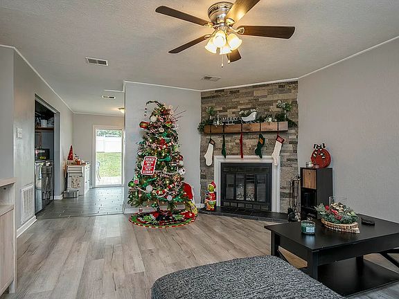 Beautiful wood burning fireplaceFenced in yardWhite cabinetsStainless appliancesTile floorsGranite top vanity