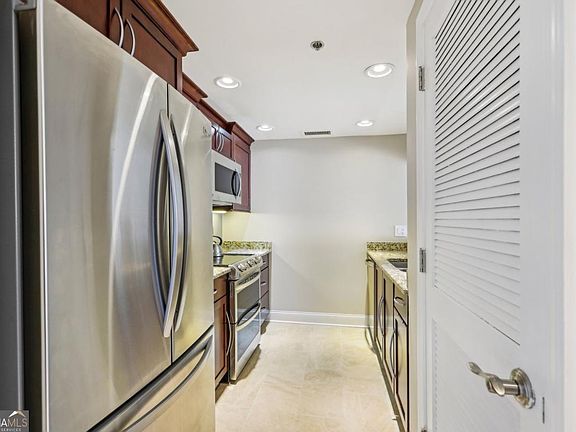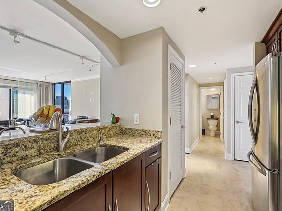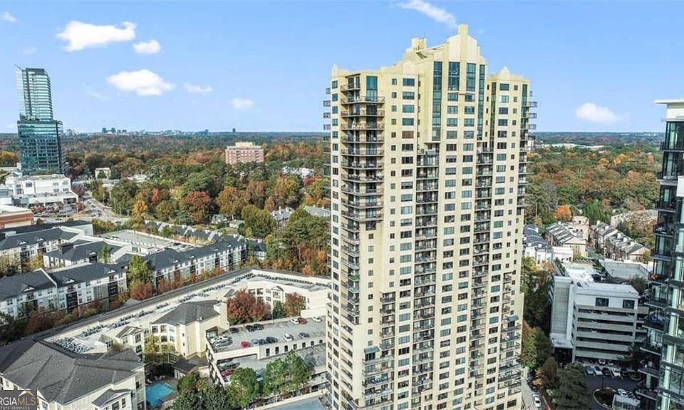 This updated unit is move-in ready with fresh paint and offers large closets, two balconies, stainless steel appliances, and bonus flex space. FLOOR PLAN: Open layout with south-facing windows. Two bedrooms, two full bathrooms, two balconies, several closets and bonus space. UPGRADES: Includes crown molding. KITCHEN: Bar seating connects to the main living area. Features stainless steel appliances, double oven, large pantry, and extra storage for bottles and spices. LIVING / DINING AREA: Hardwood floors and large windows. Drapes included. Electrical outlets behind the drapes allow for optional lighting or automatic window coverings. PRIMARY BEDROOM: Spacious room with east and south exposures, wall-width closet and walk-in closet. The bonus space is ideal for use as an office, dressing room, or studio. ENSUITE BATHROOM: Dual sinks and a walk-in shower. Full-size stacked washer/dryer included. SECOND BEDROOM: Walk-in closet, balcony access, and space-saving pocketdoor to the living area. Versatile room that has been used as a bedroom and a dining room is now an office / tv room. SECOND BATHROOM: Jetted tub/shower combination and a large linen closet. HALLWAY: Has large closet. BALCONIES: Watch fireworks over Lenox Square Mall from one of the two private balconies. PARKING: Two deeded parking spaces - one on G3 near an exit and one on Level 5 across from a building entrance. STORAGE: Private storage unit included. AMENITIES: Community features include a club room with kitchen, 18-seat theatre,conference room, library, cardio room, weight room, electric vehicle charging stations, pool, hot tub, sauna, outdoor grilling area with three grills,business center, and complimentary visitor parking. On-site 24-hour concierge. LOCATION: Next to Marie Sims Park and within walking distance to shopping, groceries, fitness centers, public transportation (MARTA), and easy access to I-85