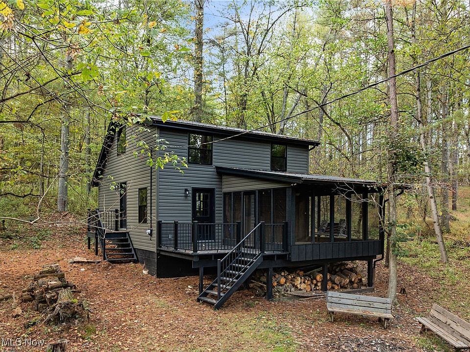 Tucked away among the trees with a view of Piedmont Lake, this fully updated cabin perfectly balances rustic charm with modern finishes. The sleek black exterior and new metal roof set the tone for what’s inside — every detail has been refreshed, including brand-new siding, windows, gutters, soffit, fascia, flooring, appliances, water tank, and water filtration system. Inside, warm wood tones and open-beam ceilings create a cozy, cabin-like atmosphere, complemented by stylish updates throughout the kitchen and bath. Located within the Muskingum Watershed Conservancy District, this property includes HOA access and a designated location to build your own boat dock according to MWDC specs — making it easy to enjoy all that the lake has to offer. Whether you’re seeking a full-time home or a weekend getaway, this cabin delivers the peaceful escape you’ve been dreaming of, just a short walk to the lakefront.