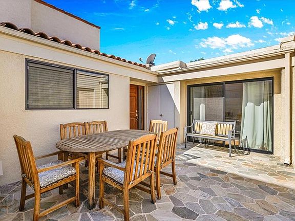 Discover this private and inviting condo, perfectly designed for comfort and convenience. A rare attached two-car garage with built-in storage sets this property apart. Inside, travertine floors flow seamlessly throughout, complementing the spacious great room with a wet bar--ideal for entertaining. The kitchen features a cozy sitting area, while a dedicated office space provides functionality for today's lifestyle. Enjoy the best of outdoor living with both a front courtyard and a back patio, perfect for relaxing and taking in the upcoming cooler weather. The home is ideally located near the community pool, spa, and expansive green space. This phase of the community is scheduled for fresh exterior painting soon. HOA benefits include a Spectrum package with Wi-Fi and Cable TV, ensuring convenience and value. Club and Fitness Memberships are not included but available through Mission Hills Country Club.