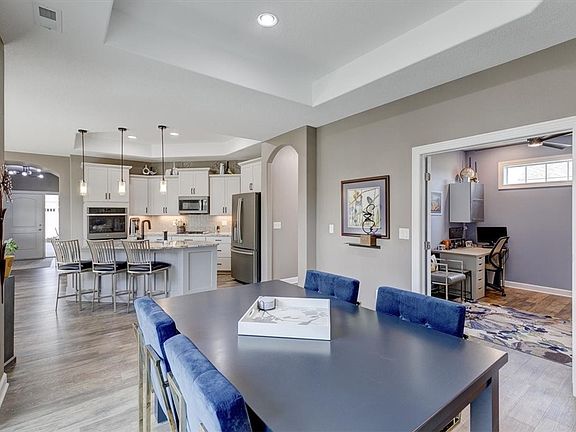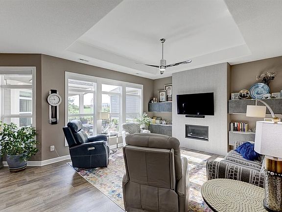 Impeccably cared for ranch villa in the 55+ Courtyard of Shadow Creek neighborhood. It boasts almost 1,800 SF of living space & offers a multitude of features/upgrades. Community building/activities/outdoor swimming pool are just a short walk away. Step inside to discover the kitchen showcasing beautiful staggered cabinets/under cabinet lighting. Open floor plan connects kitchen, which boasts a large island w/ SS appls. Dining area overlooks the private patio. Notable highlights include rounded corners/tray ceilings/beautiful arches/transom windows, contributing to its architectural charm. Entire home is adorned with LVP flooring, ensuring durability. Laundry room boasts cabinetry/sink. Hardwired blinds in dining/living rooms offer easy adjustment, while nicher cabinets in living room provide stylish storage options. Electric fireplace, embraced in tile, for those cozy evenings. Dining room is captivating w/ featured wall, adding a unique focal point. Primary suite offers generous space & luxurious bathroom w/ dual sinks/“L” shaped walk-in tiled shower. Guest bedroom is also spacious plus a cozy den/office. 2nd bathroom showcases a tiled shower w/ slider doors. Custom closets can be found throughout the home. Constructed with 2X6 construction. Garage is insulated/epoxy flooring/custom cabinets/pull-down storage. Outside, an oversized patio & courtyard provide ample space for entertaining/relaxation. Overall, this inspiring ranch embodies elegance/functionality/organization.