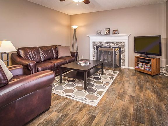 Like new turn key move in! New Andersen "Renewal" windows, engineered wood flooring, carpet, stainless appliances, glass tile backsplash, interior paint, lighting/fans, interior & exterior doors, refreshed cabinetry, bath. End unit quad with S/W exposure. 2BRs plus loft, eat-in kitchen, living room with FP walk out to courtyard patio with new privacy fence. Great location in natural setting close to lakes, parks, walking paths, schools, and shopping!