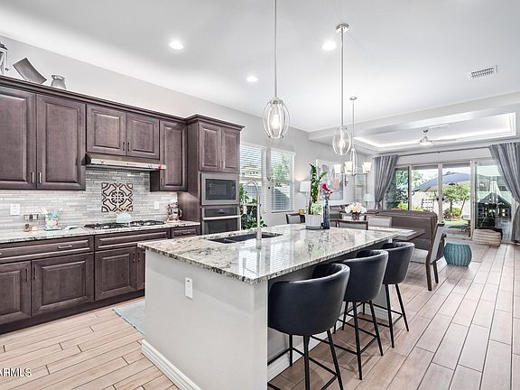 Stunning, almost new Fulton Home in Lakeview Trails at Morrison Ranch. Homes open floor plan offers 3 bedrooms, 2 baths plus flex room. Cozy front porch invites you into this beautifully maintained property with many upgrades. Extra wide designer iron security door welcomes you. Chef kitchen boasts GE Profile Stainless appliances, granite counters, upgraded soft close cabinetry, center island, tile backsplash, above & below cabinet lighting, and more. Great room is open to the kitchen & dining area. Tray ceilings in GR w/shelf lighting. Primary suite offers tray ceiling, large walk in closet, separate shower & tub, & double sinks. Ceiling fans in all rooms, and patio. Private backyard with covered patio, paver pathways, Pergola, artificial grass, mature landscape & above ground spa.