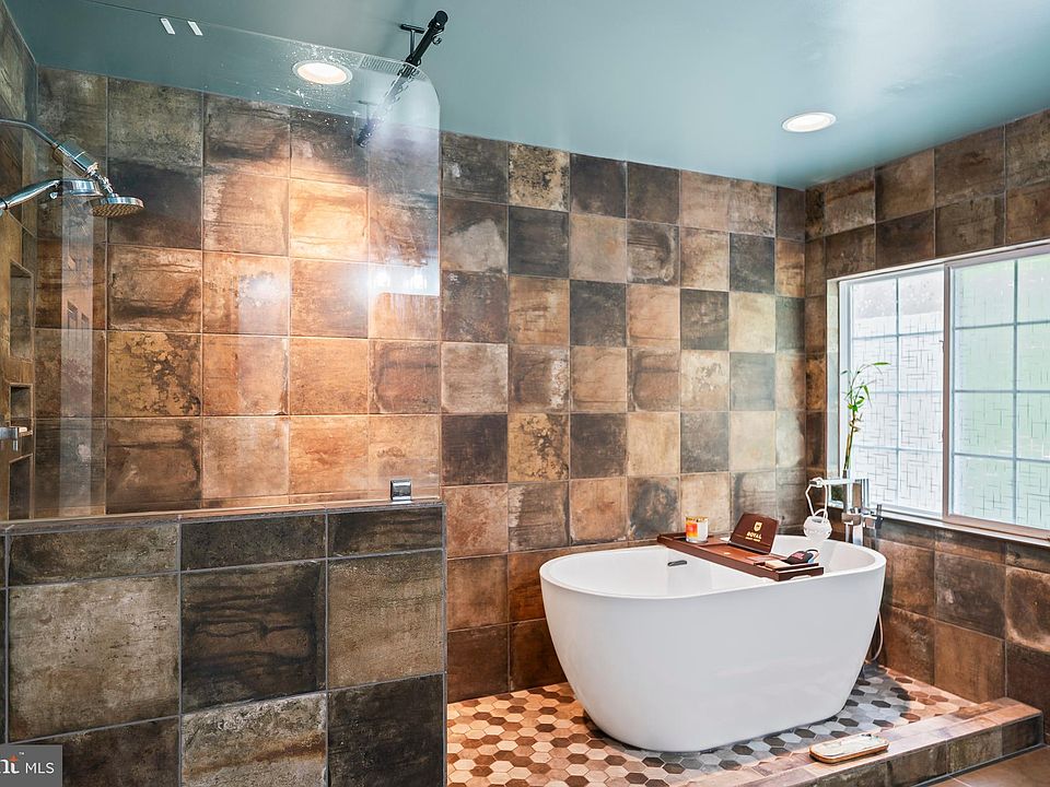 Maintenance free trek deckCustom stone patioRemodeled open tile showerGorgeous tile showersGranite countertopsSpinning spice rackBreakfast area