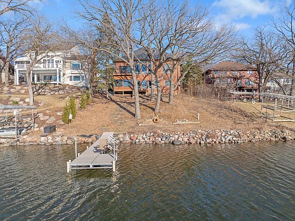 Wonderful west facing Lake Johanna lakefront. Fully recreational lake with 90 feet of frontage. As you enter, you will enjoy beautiful views of the lake from the floor to ceiling windows and patio door in this large, five bedroom, three bathroom walkout rambler. Main level boasts Brazilian cherry flooring, open living room/dining room/kitchen with gas fireplace, primary bedroom with en suite, second bedroom, powder room, new composite deck, laundry room, and attached garage. Expansive picture windows overlooking the lake with 12' ceilings are a site you will wake up and enjoy every morning. Natural light showers this lower level walkout, large family room with gas burning fireplace, three additional bedrooms, a full bath, recreation room, three season porch overlooking the lake, and wine cellar. The exterior is all brick, new synthetic 50 year roof, new copper gutters, new solar panels, new permeable driveway and parking area, and new retaining wall. This home will not disappoint! Home comes with optional membership and access to the Island Beach Club for additional fee. Dock is included in the sale.