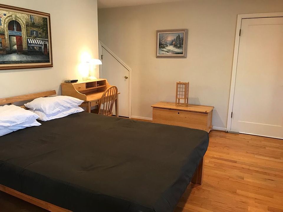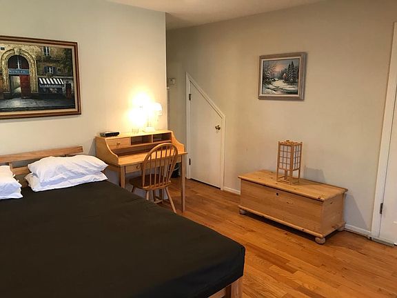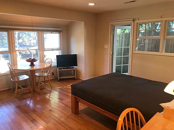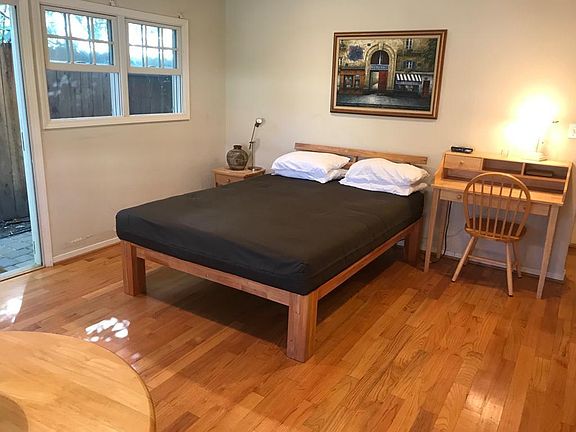 This unit is part of a house with its own private entrance. It comes fully furnished with a bed, table, and chairs. Features include hardwood floors, large windows with a backyard view, a small refrigerator, and a microwave. Ideal for a Stanford student. Please note: no pets, and there is no kitchen.