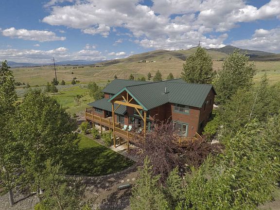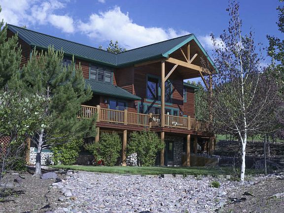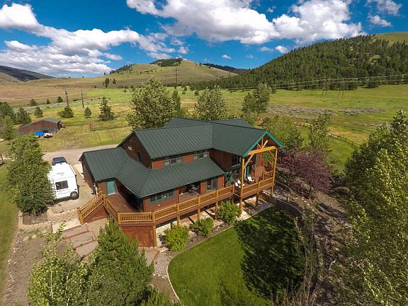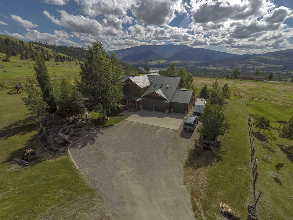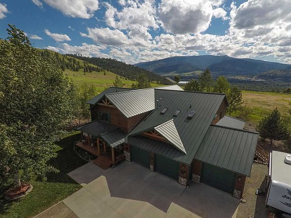Western Montana Estate with panoramic views of Lolo Peak, Missoula valley, and the Bitterroot, with 6 bedrooms, 4.5 bathrooms, over 6,000 square feet on 10 plus acres set up for horses. Barn and riding arena with entire property fenced. Cedar sided home with log accents; granite counter tops and stainless steel appliances in kitchen (new Kitchenaid double oven) with gas Jenn-air cooktop on island; breakfast bar made of blue pine. Nook off of kitchen with access to spacious walk-in pantry. Great room main living area with massive river rock fireplace and attached dining room; two sets of french doors to expansive wrap around deck with stairs to access side and back yards on both ends. Main floor master with french doors to deck. and newly remodeled master bath with large