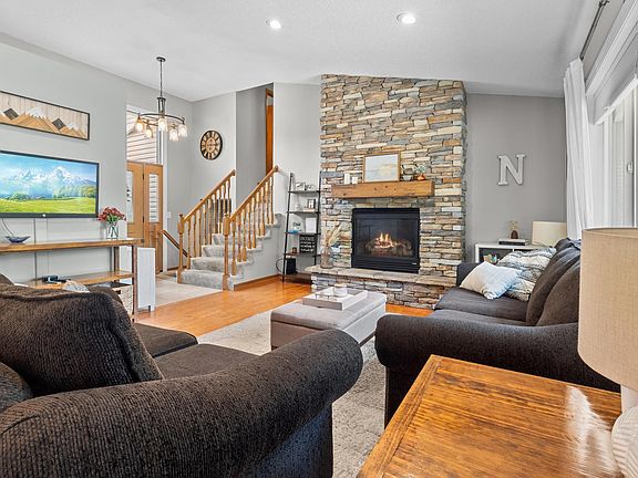 Welcome to 349 69th Street N! This tastefully designed home is located in the highly sought-after Mahtomedi school district and is nestled in a quiet neighborhood. The foyer welcomes you into the open main floor layout, featuring soaring vaulted ceilings and abundant natural light. Main floor rooms include a living room with a stone floor-to-ceiling gas fireplace, dining room with access to the backyard deck, and kitchen complete with stainless steel appliances and tons of cabinet and counter