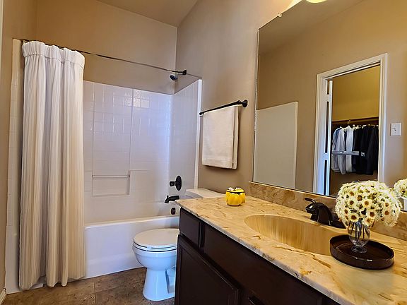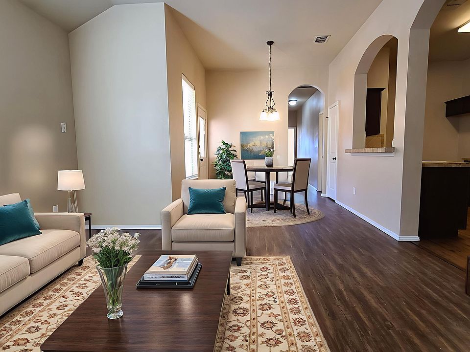 Tall ceilings, arched doorways, and timeless finishes set the tone in this charming home located in the highly sought-after Grand Heritage West community! Inside, you'll find custom ceramic tile, a breakfast bar, tile counters, bronze Victorian-style fixtures, and neutral designer paint throughout. The thoughtful floor plan includes walk-in closets, a separate utility room, and a private backyard entrance from the primary suite. A side patio provides the perfect spot for morning coffee or evening relaxation.
