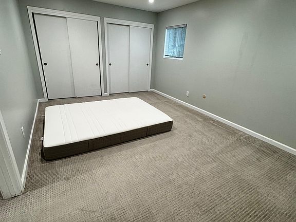 -A spacious and bright primary bedroom with dual sliding-door closets.