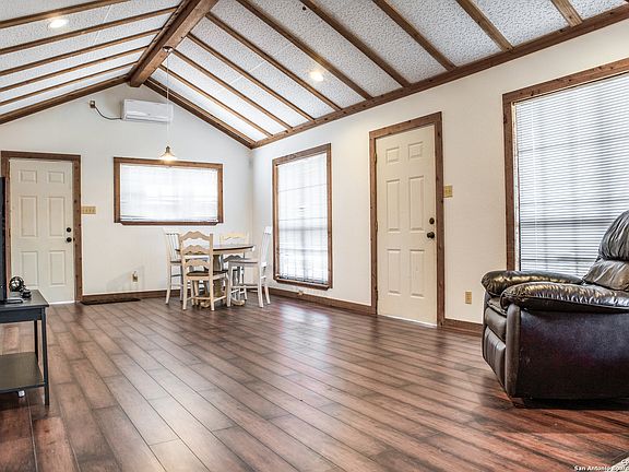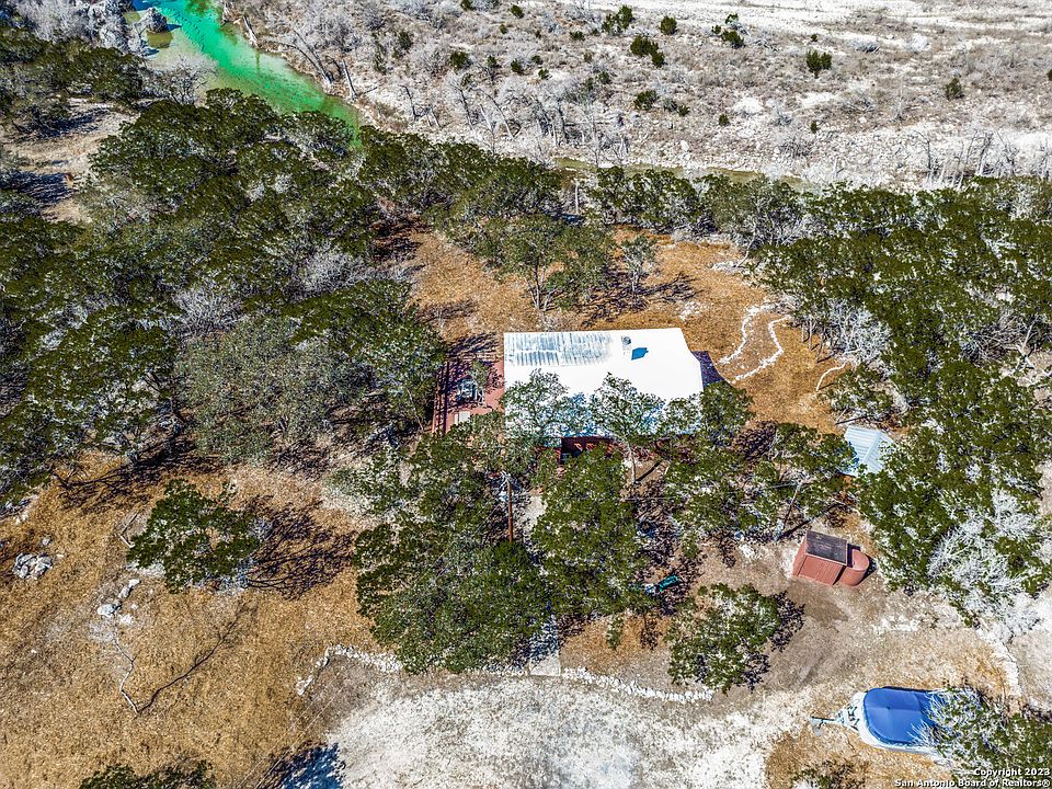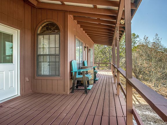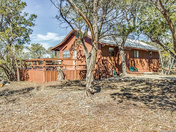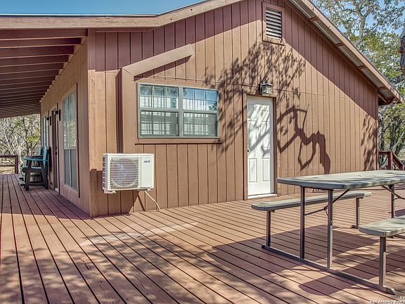 Charming water view home offering river access located in the beautiful Hill Country. This secluded property is surrounded by mature trees with open space allowing plenty of room for RV or boat parking. Partial wrap around porch to enjoy sunsets & tranquil evenings. Home features two bedrooms, two full baths with an open floor concept and fireplace for chilly nights with spacious living room, vaulted ceilings, wooden beams & recessed lighting. Cozy kitchen offers bar seating along with granite countertops, electric stove, refrigerator and new cabinets. Bathrooms recently renovated with new vanity & washer and dryer inside the home. Owner recently installed; outside closet to store new water heater, new water well cover with a new pump, new mini split units and new fence on the west side of property. Property has a detached shed for extra storage. The gorgeous deck outside perfect for entertaining has recently been stained and treated and most of yard has been cleared. New owner can tap on to city waterline at road. Access to water provides an electric metal staircase which extends out conveniently allowing you direct river access. This property is MUST SEE! All furnishings in home convey allowing immediate cash flow as a VRBO / Airbnb investment! A low voluntary HOA $100 annual fee to access Medina Lake Park.