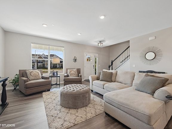 Experience the height of modern luxury! This stunning 3 bedroom + office + loft, 2.5 bathroom Craftsman-style townhome is one of the largest floor plans in this townhome community. Located in one of the area's most prestigious neighborhoods, this home commands attention with its striking blue siding and stone facade. A welcoming covered porch and charming patio complete your own low-maintenance outdoor sanctuary. Inside, you'll find a beautifully curated open-concept floor plan that seamlessly blends comfort and elegance. The gourmet kitchen impresses with 42" white cabinetry, GE & LG stainless steel appliances, a modern backsplash, and a spacious island - ideal for both casual family meals and grand entertaining. Luxury hardwood vinyl flooring flows throughout the main level, connecting the kitchen, living, and dining areas, while a private office overlooks the patio, offering the perfect work-from-home retreat. Upstairs, the luxurious primary suite is a tranquil escape, featuring a custom accent wall, walk-in closet, and a spa-inspired en-suite bath with a double vanity and an oversized walk-in shower. Two additional bedrooms share a stylish dual-sink bathroom, while a versatile loft area provides additional living space for lounging or play. A convenient 2nd floor laundry room elevates everyday living. The full basement offers endless potential - whether you envision it as a recreation room, home gym, or additional storage. With all the premium upgrades already completed by the current owners, this home is move-in ready and situated in the neighborhood with walking paths, basketball & pickleball courts! Located in the highly-rated Stevenson High School District, and just minutes from train station, shopping, dining, and entertainment. This exceptional townhome promises a lifestyle of unrivaled sophistication and ease.