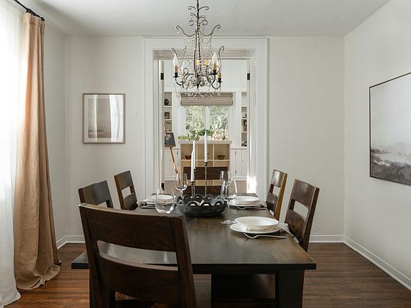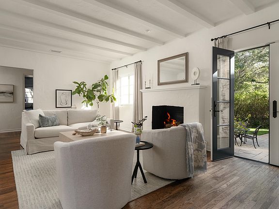 Upon entry, you're welcomed into the formal living room, where heritage wood floors, painted custom ceiling beams, and soft natural light create a warm and inviting atmosphere. An elegant fireplace serves as the room's focal point, while a glass door opens to the spacious backyard, where a beautiful oak tree with a swing invites slow mornings and peaceful afternoons. (more) The intimate dining room offers a private setting for gatherings both large and small. Just beyond, a sunlit office framed by charming multi-pane windows provides an inspiring space for work, reading, or creative pursuits.