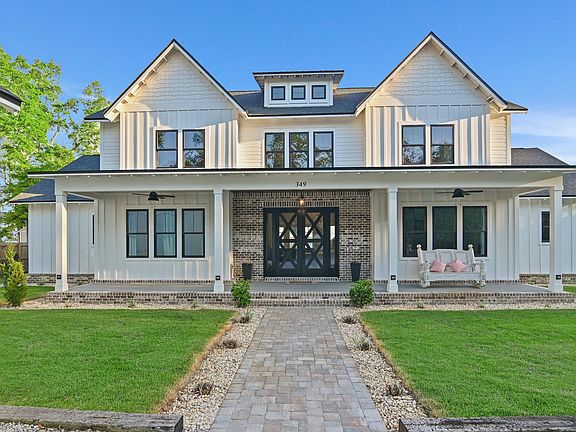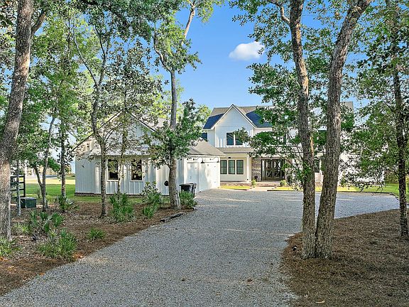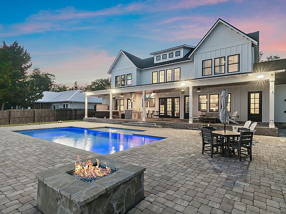 Absolutely Stunning Bayfront Estate featuring immaculate 2022 Coastal Farmhouse construction on coveted Red Barn Road in Flood Zone X. 4 Bed/4.5 Bath with detached garage, pool, yard, dock spanning .66 acres with 100' of Bay frontage. The spacious private drive with ranch style fence welcomes you into the serene beauty of pristine Bayfront living offering tranquility and space to live your best life without the confines of an HOA. Gorgeous front elevation with custom Coastal Farmhouse design greets you with a warm from porch featuring tongue and groove ceilings and a hurricane proof front door that will blow you away with its glamor and stature. The Southern charm blends Coastal elegance as you enter the home. French Oak hardwood floors span the downstairs open living concept with raised coffered tongue and groove ceilings projecting natural light onto shiplap wall feature from Bayview windows
