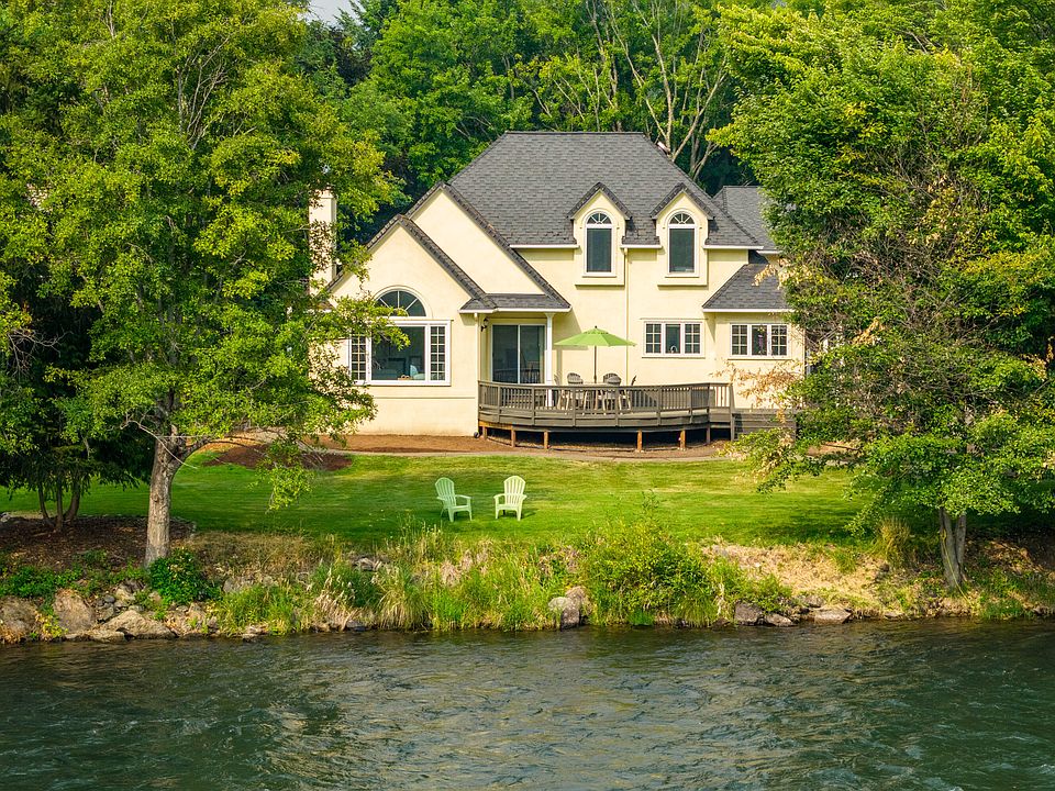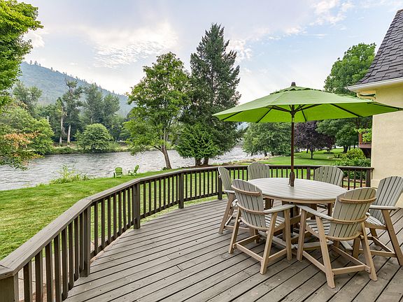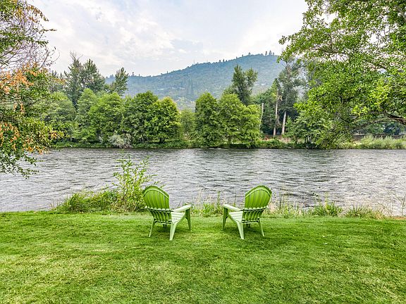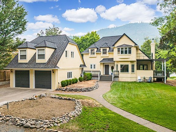 Experience Rogue River living at its best in this gorgeous, riverfront Country French Estate. Designed to perfection, this captivating 2-story home boasts 3 bedrooms, 2 baths with excellent river frontage. This home is the perfect place to relax while enjoying the day. The living room features enchanting river views & a quadrafire pellet stove. The kitchen w/walk-in pantry & cozy breakfast nook invite tranquility to your mornings. The spacious primary suite presents an idyllic sanctuary overlooking the river, complete with a jetted tub. Outdoors, the lush lawns & trees are beautiful, while river irrigation ensures greenery all year round. The low bank river access is great for fishing. There is a detached 2 car garage & a large basement with lots of storage space. The 1bed/1bath guest quarters offer flexibility for extended family stays or a home office. All of this situated on 1.25 acres in one of the most desirable areas along the Rogue. Sq. Ft. includes guest quarters of 592 sq ft.