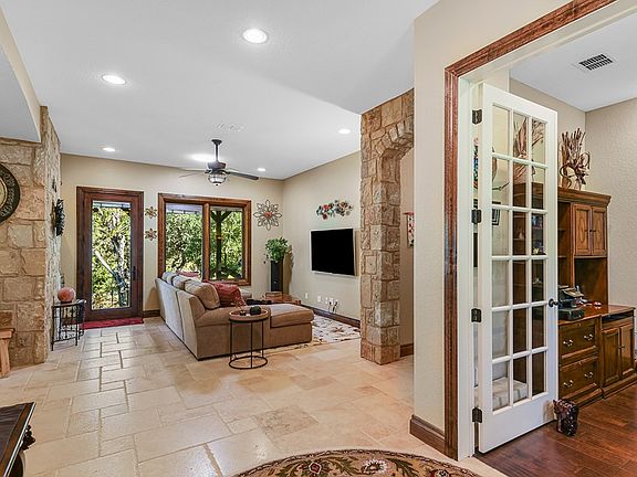 Located on a gorgeous Frio river front lot, this quality, custom home is a true showplace! The kitchen/dining/living spaces flow seamlessly together and have views of the river with a stunning 24'x7' tempered glass "wall" in the hearth room being the crowning touch. The large owner's suite w/sitting room is on one side of the home while the other bedrooms are on the opposite side of the home. The covered back patio is huge and features 13' wood ceilings. Concrete stairs lead one down to the grassy banks of the cypress lined Frio River. The fully insulated, oversized garage plus a large, climate controlled attic provide plentiful storage plus offer opportunities for expansion of the living area. A storage shed/shop with water & electric makes a great man cave. Please see the "Features Sheet" for additional information! Call today to schedule an appointment to view this truly exceptional offering.