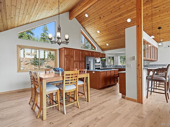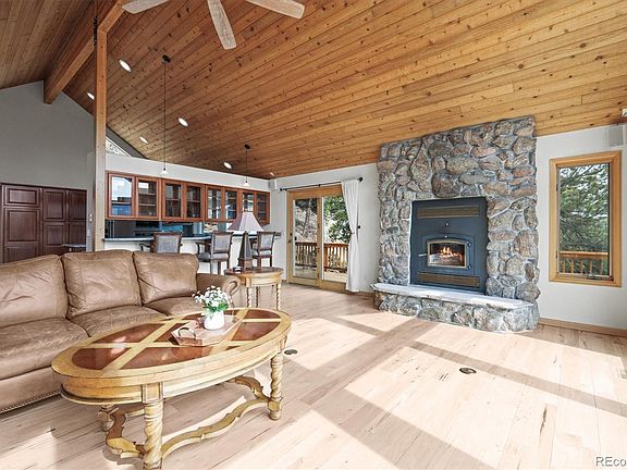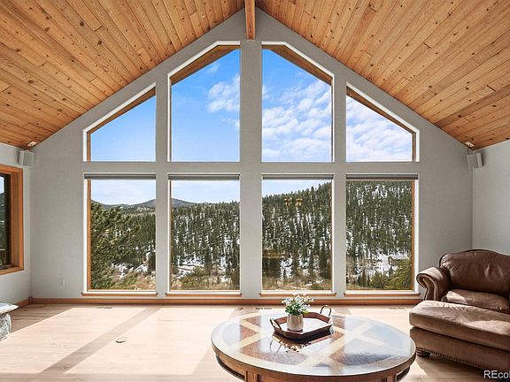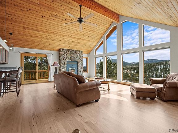 Nestled in the coveted Forest Ridge neighborhood that abuts Pike National Forest, this stunning custom home offers 180-degree unobstructed mountain views and the serene sounds of Deer Creek just 450 feet away. The newly refinished solid hickory hardwood floors flow throughout the expansive 23’x34’ great room with soaring 16-foot tongue-and-groove ceilings. The spacious chef’s kitchen features cherry cabinets, slab granite countertops with a leathered finish and chiseled edges, and a brand-new high-end KitchenAid six-piece suite. The main-level primary suite boasts a private deck with breathtaking south and west-facing views, a spa-like ensuite with a jetted tub, bay window, and a spacious walk-through closet. This home offers multi-generational living potential with a lower-level walk-out mother-in-law suite, complete with a wet bar, built-in cabinets, gas fireplace, private entrance, and an oversized bedroom with a Jack-and-Jill bath. A versatile sunroom provides extra space for an office, craft room, yoga studio, or plant haven. With 43 windows allowing for passive solar heating, three fireplaces, and a whole-house generator, this home is warm and inviting year-round. Enjoy three newly replaced decks where you can watch bighorn sheep, deer, and moose in their natural habitat. Experience meticulous maintenance and exceptional craftsmanship in this incredible Colorado mountain retreat. Fly-through video: https://www.youtube.com/embed/GvG7cbfLAeA