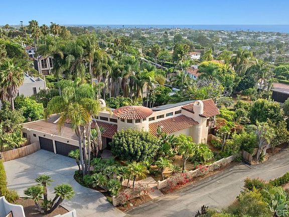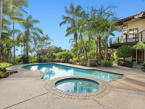 Nestled at the end of a private dead-end street, this unique Ocean view custom-built home offers complete privacy. The owners designed and built the home with the help of local architect Stuart Resor known for his seamless butt glass designs. Offering approximately 3517 sq. ft, 4 Br 3 Ba siting on a 17,000 sq.ft. lot truly could be your tropical oasis. The resort style landscaping with sparkling pool & spa, many species of palm trees, lovely raised bed gardens, a large lush green lawn area, and still room for more. Ocean & sunset views can be seen from multiple points on the main level and the large wrap around deck are artistically framed through the flowing palm fronds. The sunken formal Livingroom with soaring ceiling built in bench, cozy fireplace and built in book shelves is the center piece of the home. A spacious primary retreat on the main level is very light & bright with many windows and a pair of French doors which open beautifully overlooking the mature landscaping and beyond to the ocean. A large kitchen wraps around the butcher block island offering stainless appliance and tons of cabinets. Lower level is perfect for kids or extended family with secondary family room/game room, 3 Br 2 Ba, potential for a sauna, and “dark room” for photography development. Property was recently painted on the interior and exterior, new carpet installed in all bedrooms, wood and title floors refinished, and a termite clearance make this home move in ready. Owned solar and wired for EV charger. Short distance to Grandview State Beach access and many of Leucadia’s restaurants, bars, and eclectic shops and boutiques. This home is perfect for those looking for an escape to a serene, private hideaway.