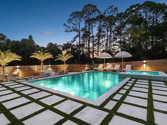 Beautifully curated decorLarge windowsExquisite outdoor kitchenSparkling poolLush tropical landscapingWhite shiplap sidingStunning outdoor area