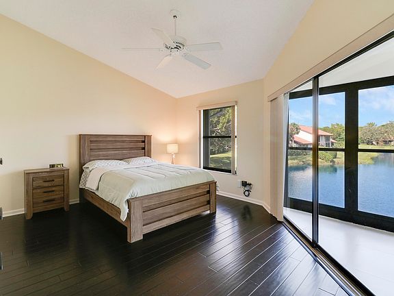 Don't miss this striking 2 BR / 2BA 2nd floor condo in the gated 55+ community of Montego Cove with SPECTACULAR LONG LAKE VIEW. Furnishings are negotiable. This STYLISH KITCHEN WITH QUARTZ COUNTERS & ISLAND, has tile backsplash, pendant lighting & top of the line SS appliances. There are bright 36'' PORCELAIN TILES in Great Room w/ high vaulted ceilings & Bonus space as former porch floor was raised to increase interior living area. Bedrooms have dark engineered wood floors. Guest Bath was remodeled. Has 2018 3-ton A/C Unit & appliances updated in 2017. 2 Walk-in closets. Full Accordion Shutters, Lots of outdoor space w/ relaxing front porch & private ground patio with barbecuing area & storage room. This Busy Community offers 2 pools, clubhouse, tennis, pickleball & plenty of activities