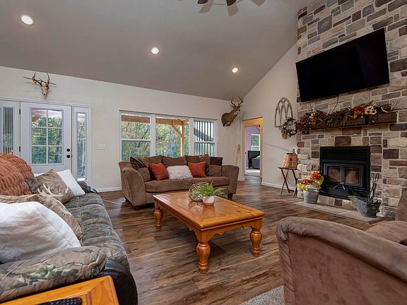 Nestled deep within ten wooded acres just teeming with wildlife, this brand new custom-built home is a lovely blend of rustic elegance and fine craftsmanship. Every inch reveals the attention to quality and design, featuring luxurious cabinetry, premium countertops and thoughtful, whimsical fixtures throughout.Step inside and be greeted by the warmth of a soaring stone fireplace that rises to the ceiling, setting the tone for the home's inviting, lodge-like atmosphere. The open floorplan creates effortless flow between living, dining, and kitchen spaces, perfect for entertaining or cozy family gatherings.The chef's kitchen is designed to impress and feed an army, with miles of workspace, a large angled island, two ovens, a gas range, and an 8x8 walk-in pantry offering abundant storage. Adjacent to the kitchen, the spacious dining area easily accommodates a large table for hosting memorable meals.A massive laundry and utility room adds both function and flexibility. All the bedrooms are extra large, including the extra spacious primary suite. Outdoors, two enormous covered porches extend your living space into the landscape. The front porch, with its rustic cathedral ceiling, welcomes guests in grand style, while the back porch offers a quiet vantage point to enjoy the sights and sounds of the surrounding forest.Completely enveloped in nature, this property is a rare blend of luxury, privacy, and natural beauty, offering a true haven for those seeking space, solitude, and solid craftsmanship.